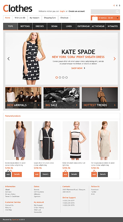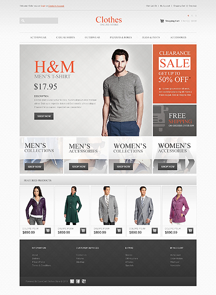 Template Name: Clothes Store Item number: 43579 Template Type: OpenCart Author: Hermes Downloads: 3 OpenCart Engine: 1.5.5.1 OpenCart Compatibility: 1.5.5.1 Sources Available: .PSD;.PNG;.PHP;.TPL;.JS Software Required: Adobe Photoshop CS+;Apache Server;Adobe Dreamweaver 8+ (or any php-editor);For uncompressing a template ZIP package: ...