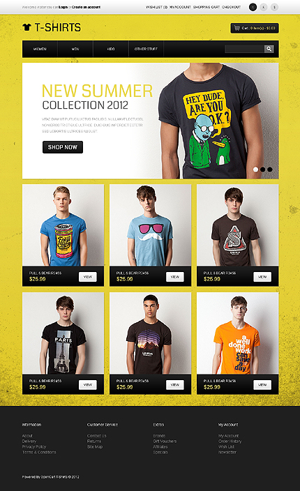 Template Name: Funny T-Shirts Item number: 41477 Template Type: OpenCart Author: Ares Downloads: 3 OpenCart Engine: 1.5.4.1 OpenCart Compatibility: 1.5.4.1 Sources Available: .PSD;.PNG;.PHP;.TPL;.JS Software Required: Adobe Photoshop CS+;Apache Server;Adobe Dreamweaver 8+ (or any php-editor);For uncompressing a template ZIP package: W...