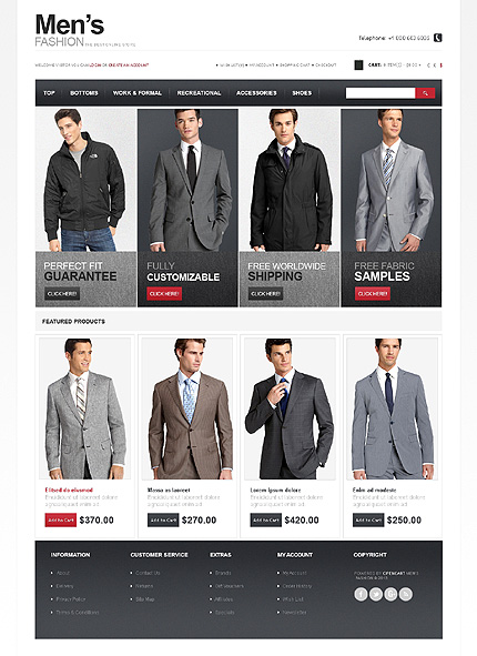 Template Name: Men's Fashion Item number: 43627 Template Type: OpenCart Author: Sawyer Downloads: 1 OpenCart Engine: 1.5.5.1 OpenCart Compatibility: 1.5.5.1 Sources Available: .PSD;.PNG;.PHP;.TPL;.JS Software Required: Adobe Photoshop CS+;Apache Server;Adobe Dreamweaver 8+ (or any php-editor);For uncompressing a template ZIP package: ...