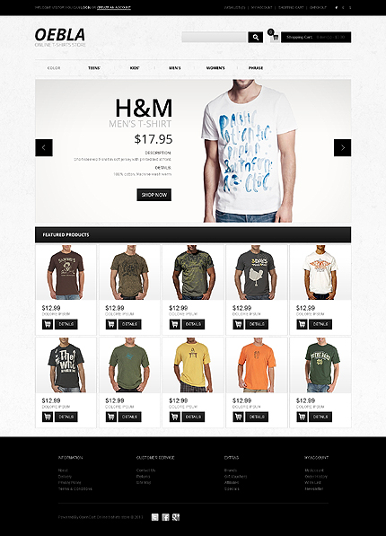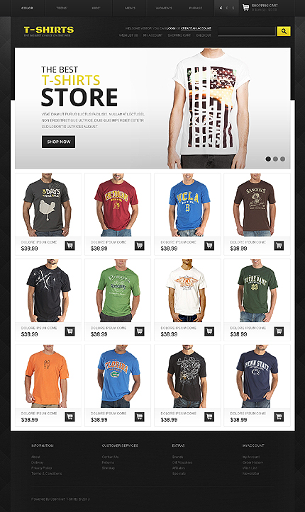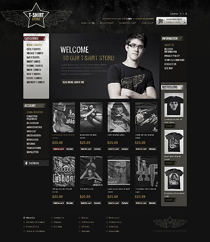 Template Name: T-Shirt Store Item number: 43628 Template Type: OpenCart Author: Hermes Downloads: 2 OpenCart Engine: 1.5.5.1 OpenCart Compatibility: 1.5.5.1 Sources Available: .PSD;.PNG;.PHP;.TPL;.JS Software Required: Adobe Photoshop CS+;Apache Server;Adobe Dreamweaver 8+ (or any php-editor);For uncompressing a template ZIP package: ...
