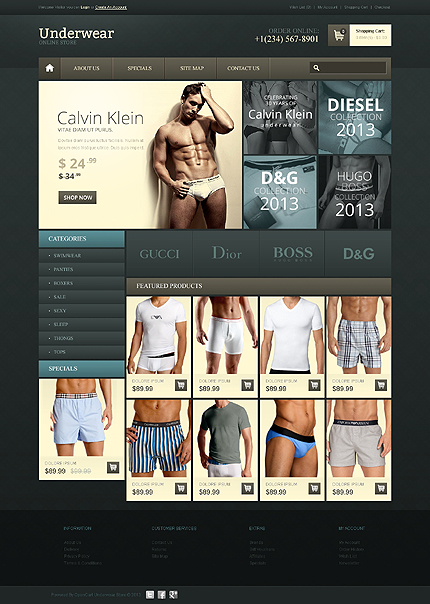 Template Name: Underwear Store Item number: 44693 Template Type: OpenCart Author: Ares Downloads: 1 OpenCart Engine: 1.5.5.1 OpenCart Compatibility: 1.5.5.1 Sources Available: .PSD;.PNG;.PHP;.TPL;.JS Software Required: Adobe Photoshop CS+;Apache Server;Adobe Dreamweaver 8+ (or any php-editor);For uncompressing a template ZIP package: ...