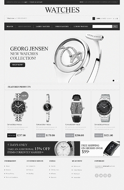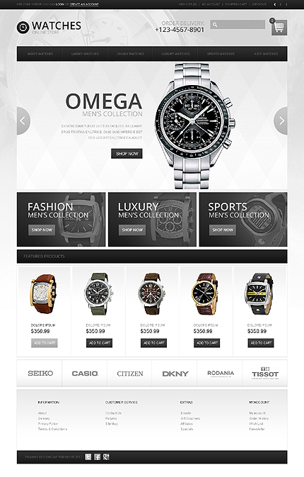 Template Name: Watches Item number: 43580 Template Type: OpenCart Author: Sawyer Downloads: 2 OpenCart Engine: 1.5.5.1 OpenCart Compatibility: 1.5.5.1 Sources Available: .PSD;.PNG;.PHP;.TPL;.JS Software Required: Adobe Photoshop CS+;Apache Server;Adobe Dreamweaver 8+ (or any php-editor);For uncompressing a template ZIP package: WinZip...
