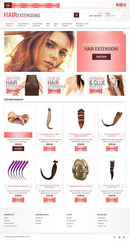 Template Name: Long Hair Item number: 47398 Template Type: OpenCart Author: Hermes Downloads: 1 OpenCart Engine: 1.5.6 OpenCart Compatibility: 1.5.6 Sources Available: .PSD;.PNG;.PHP;.TPL;.JS Software Required: Adobe Photoshop CS+;Apache Server;Adobe Dreamweaver 8+ (or any php-editor);For uncompressing a template ZIP package: WinZip 9...