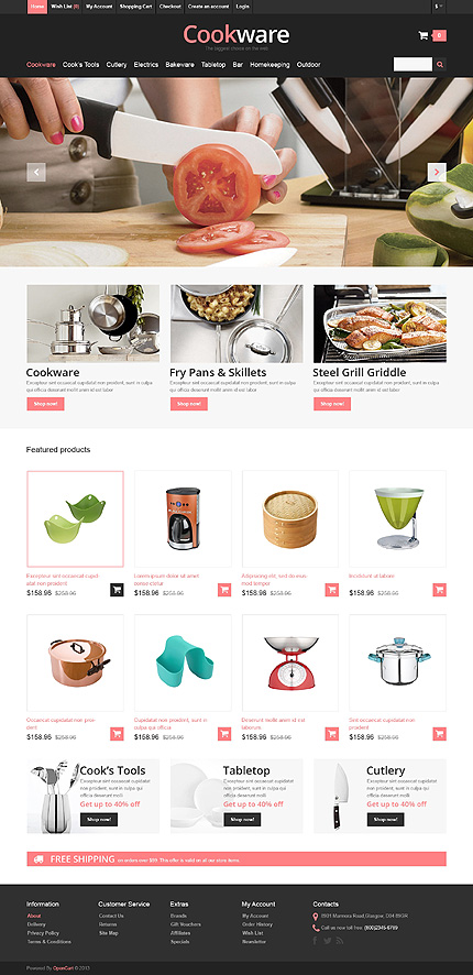 Template Name: Responsive Cookware Store Item number: 46437 Template Type: OpenCart Author: Hermes Downloads: 0 OpenCart Engine: 1.5.6 OpenCart Compatibility: 1.5.6 Sources Available: .PSD;.PNG;.PHP;.TPL;.JS Software Required: Adobe Photoshop CS+;Apache Server;Adobe Dreamweaver 8+ (or any php-editor);For uncompressing a template ZIP p...