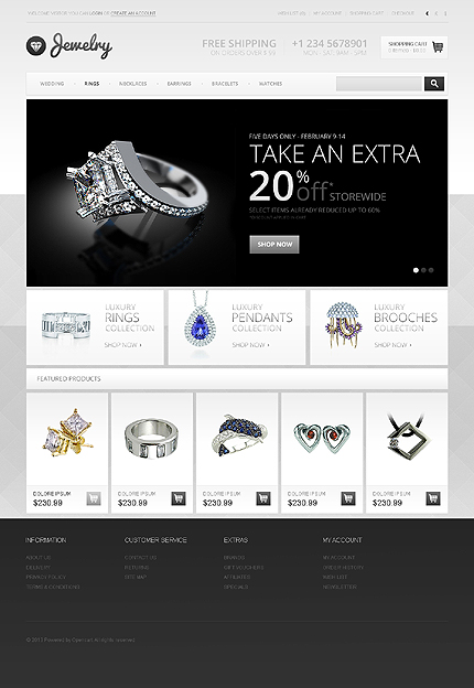 Template Name: Jewelry Store Item number: 44137 Template Type: OpenCart Author: Ares Downloads: 3 OpenCart Engine: 1.5.5.1 OpenCart Compatibility: 1.5.5.1 Sources Available: .PSD;.PNG;.PHP;.TPL;.JS Software Required: Adobe Photoshop CS+;Apache Server;Adobe Dreamweaver 8+ (or any php-editor);For uncompressing a template ZIP package: Wi...