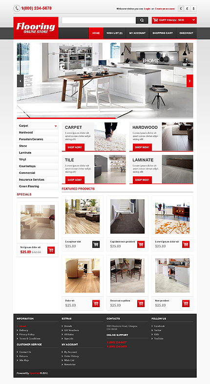 Template Name: Online Flooring Store Item number: 44052 Template Type: OpenCart Author: Mercury Downloads: 3 OpenCart Engine: 1.5.5.1 OpenCart Compatibility: 1.5.5.1 Sources Available: .PSD;.PNG;.PHP;.TPL;.JS Software Required: Adobe Photoshop CS+;Apache Server;Adobe Dreamweaver 8+ (or any php-editor);For uncompressing a template ZIP ...