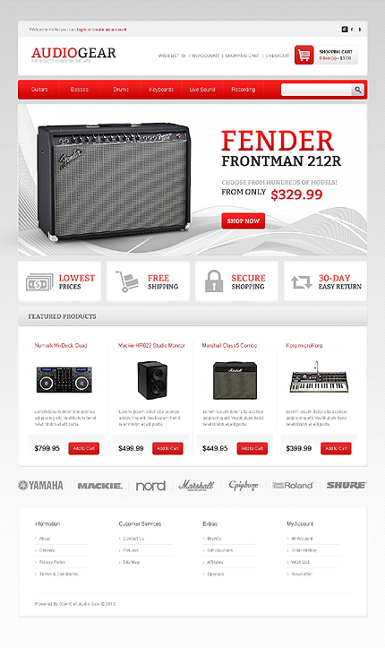 Template Name: Audio Gear Item number: 41341 Template Type: OpenCart Author: Ares Downloads: 2 OpenCart Engine: 1.5.4.1 OpenCart Compatibility: 1.5.4.1 Sources Available: .PSD;.PNG;.PHP;.TPL;.JS Software Required: Adobe Photoshop CS+;Apache Server;Adobe Dreamweaver 8+ (or any php-editor);For uncompressing a template ZIP package: WinZi...