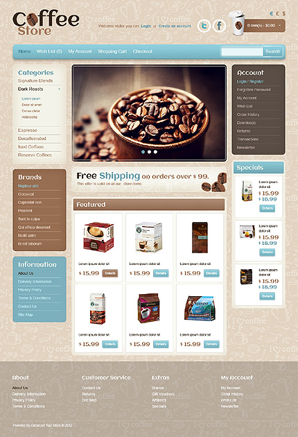 Template Name: Coffee Store Item number: 41469 Template Type: OpenCart Author: Hermes Downloads: 4 OpenCart Engine: 1.5.4.1 OpenCart Compatibility: 1.5.4.1 Sources Available: .PSD;.PNG;.PHP;.TPL;.JS Software Required: Adobe Photoshop CS+;Apache Server;Adobe Dreamweaver 8+ (or any php-editor);For uncompressing a template ZIP package: W...