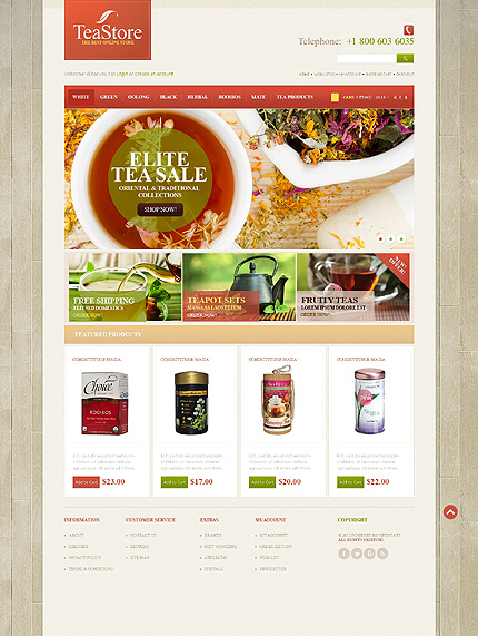 Template Name: Tea Store Item number: 43760 Template Type: OpenCart Author: Sawyer Downloads: 2 OpenCart Engine: 1.5.5.1 OpenCart Compatibility: 1.5.5.1 Sources Available: .PSD;.PNG;.PHP;.TPL;.JS Software Required: Adobe Photoshop CS+;Apache Server;Adobe Dreamweaver 8+ (or any php-editor);For uncompressing a template ZIP package: WinZ...