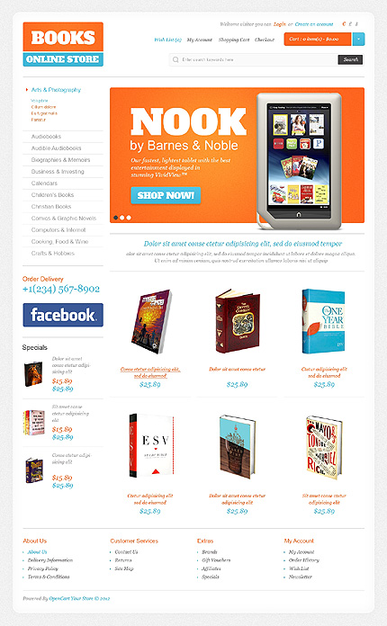 Template Name: Books for All Ages Item number: 40517 Template Type: OpenCart Author: Hermes Downloads: 3 OpenCart Engine: 1.5.3.1 OpenCart Compatibility: 1.5.3.1 Sources Available: .PSD;.PNG;.PHP;.TPL;.JS Software Required: Adobe Photoshop CS+;Apache Server;Adobe Dreamweaver 8+ (or any php-editor);For uncompressing a template ZIP pack...