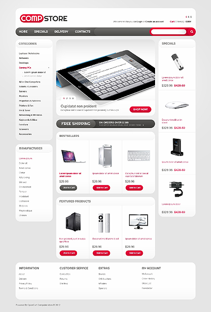Template Name: Comp Store Item number: 40839 Template Type: OpenCart Author: Hermes Downloads: 4 OpenCart Engine: 1.5.3.1 OpenCart Compatibility: 1.5.3.1 Sources Available: .PSD;.PNG;.PHP;.TPL;.JS Software Required: Adobe Photoshop CS+;Apache Server;Adobe Dreamweaver 8+ (or any php-editor);For uncompressing a template ZIP package: Win...