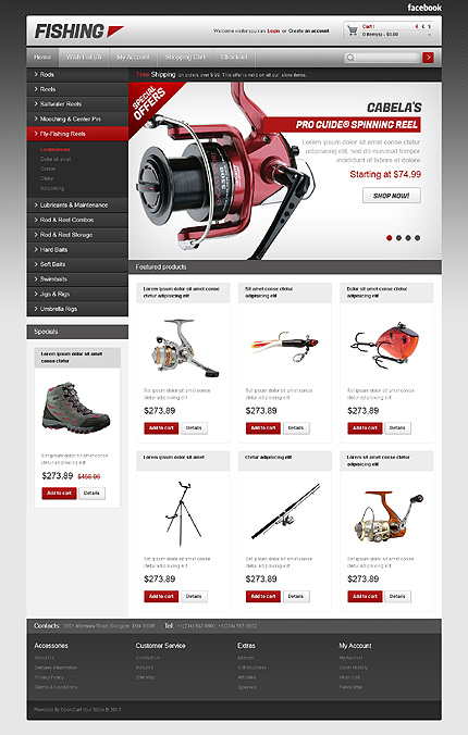 Template Name: Fishing Supplies Item number: 40722 Template Type: OpenCart Author: Hermes Downloads: 3 OpenCart Engine: 1.5.3.1 OpenCart Compatibility: 1.5.3.1 Sources Available: .PSD;.PNG;.PHP;.TPL;.JS Software Required: Adobe Photoshop CS+;Apache Server;Adobe Dreamweaver 8+ (or any php-editor);For uncompressing a template ZIP packag...