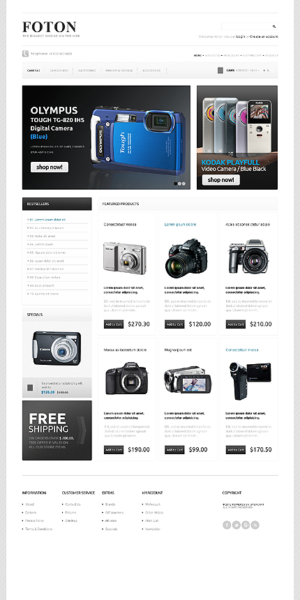 Template Name: Photo Store Item number: 40843 Template Type: OpenCart Author: Sawyer Downloads: 2 OpenCart Engine: 1.5.4.1 OpenCart Compatibility: 1.5.4.1 Sources Available: .PSD;.PNG;.PHP;.TPL;.JS Software Required: Adobe Photoshop CS+;Apache Server;Adobe Dreamweaver 8+ (or any php-editor);For uncompressing a template ZIP package: Wi...