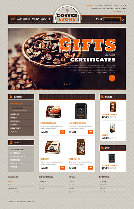 Template Name: Coffee Cup Item number: 40684 Template Type: OpenCart Author: Hermes Downloads: 2 OpenCart Engine: 1.5.3.1 OpenCart Compatibility: 1.5.3.1 Sources Available: .PSD;.PNG;.PHP;.TPL;.JS Software Required: Adobe Photoshop CS+;Apache Server;Adobe Dreamweaver 8+ (or any php-editor);For uncompressing a template ZIP package: Win...