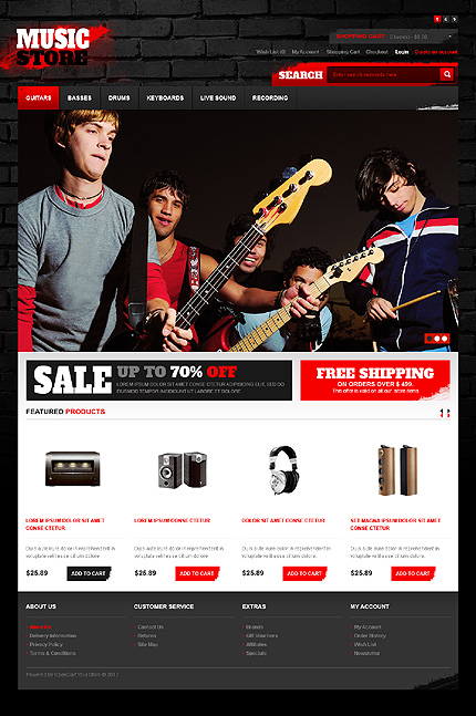 Template Name: Cool Music Item number: 40520 Template Type: OpenCart Author: Hermes Downloads: 3 OpenCart Engine: 1.5.3.1 OpenCart Compatibility: 1.5.3.1 Sources Available: .PSD;.PNG;.PHP;.TPL;.JS Software Required: Adobe Photoshop CS+;Apache Server;Adobe Dreamweaver 8+ (or any php-editor);For uncompressing a template ZIP package: Win...