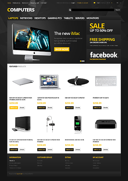 Template Name: Dark Computer Theme Item number: 40565 Template Type: OpenCart Author: Hermes Downloads: 3 OpenCart Engine: 1.5.3.1 OpenCart Compatibility: 1.5.3.1 Sources Available: .PSD;.PNG;.PHP;.TPL;.JS Software Required: Adobe Photoshop CS+;Apache Server;Adobe Dreamweaver 8+ (or any php-editor);For uncompressing a template ZIP pac...