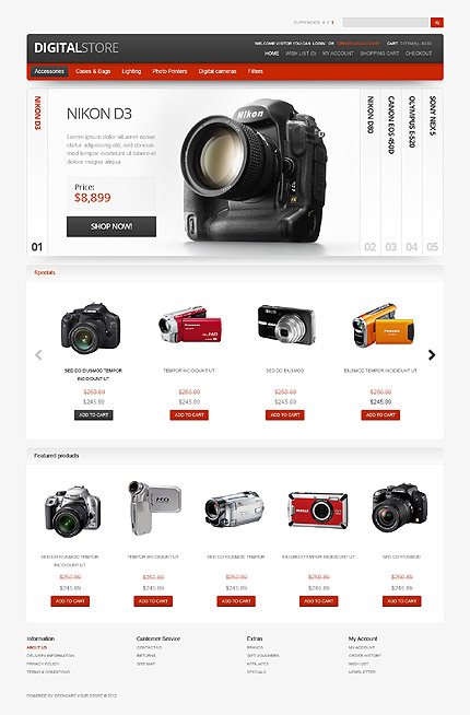 Template Name: Digital Era Item number: 40570 Template Type: OpenCart Author: Mercury Downloads: 3 OpenCart Engine: 1.5.3.1 OpenCart Compatibility: 1.5.3.1 Sources Available: .PSD;.PNG;.PHP;.TPL;.JS Software Required: Adobe Photoshop CS+;Apache Server;Adobe Dreamweaver 8+ (or any php-editor);For uncompressing a template ZIP package: W...