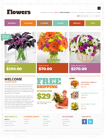 Template Name: Flowers for Your Celebrations Item number: 40524 Template Type: OpenCart Author: Hermes Downloads: 4 OpenCart Engine: 1.5.3.1 OpenCart Compatibility: 1.5.3.1 Sources Available: .PSD;.PNG;.PHP;.TPL;.JS Software Required: Adobe Photoshop CS+;Apache Server;Adobe Dreamweaver 8+ (or any php-editor);For uncompressing a templa...