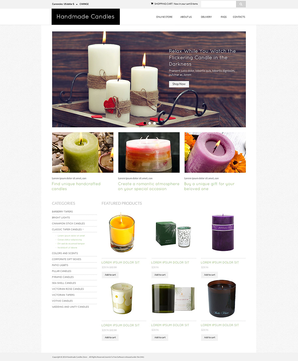 OpenCart Engine: 2.2 Additional Features: Sliced PSD, Back To Top Button, Commenting System, Crossbrowser Compatibility, Custom Page Templates, Drop Down Cart, Dropdown Menu, Favicon, Google Web Fonts, Social Options, Tooltips Additional Info: Well Documented, Customized Modules Animation: HTML plus JS Bootstrap Version: 3.2.0 Categories View: Grid, List Coding: CSS 3, HTML 5, JQuery, Seman...