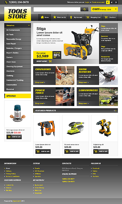 Template Name: Tools Store Item number: 44302 Template Type: OpenCart Author: Hermes Downloads: 3 OpenCart Engine: 1.5.5.1 OpenCart Compatibility: 1.5.5.1 Sources Available: .PSD;.PNG;.PHP;.TPL;.JS Software Required: Adobe Photoshop CS+;Apache Server;Adobe Dreamweaver 8+ (or any php-editor);For uncompressing a template ZIP package: Wi...