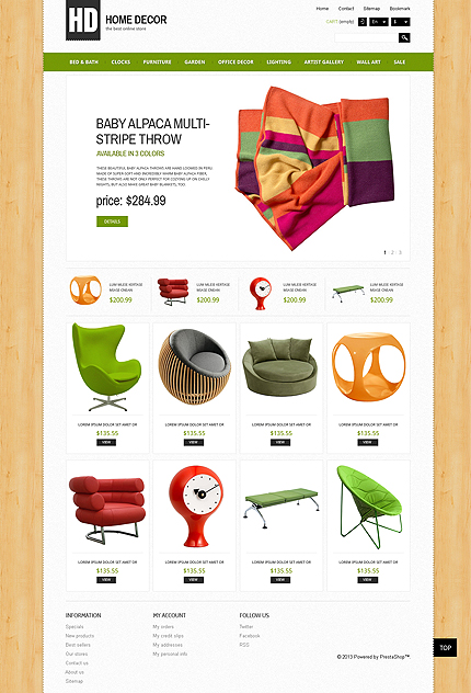 Template Name: Responsive Home Decor Store Item number: 44551 Template Type: PrestaShop Author: Di Downloads: 3 PrestaShop Engine: 1.5.4.0 PrestaShop Compatibility: 1.5.x The template is fully compatible with PrestaShop 1.5.x. But sample data SQL files are only compatible with the exact version of PrestaShop Engine it was developed for. ...