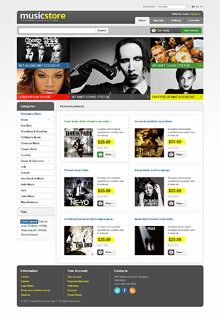 Template Name: Music Store Item number: 43577 Template Type: PrestaShop Author: Hermes Downloads: 1 PrestaShop Engine: 1.5.3.1 PrestaShop Compatibility: 1.5.x The template is fully compatible with PrestaShop 1.5.x. But sample data SQL files are only compatible with the exact version of PrestaShop Engine it was developed for. Sources Avai...