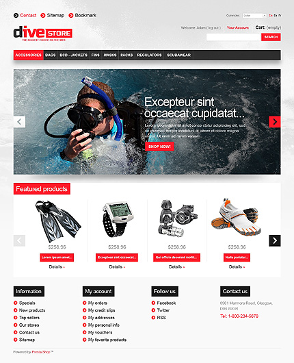 Template Name: Dive Store Item number: 43287 Template Type: PrestaShop Author: Hermes Downloads: 1 PrestaShop Engine: 1.5.3.1 PrestaShop Compatibility: 1.5.x The template is fully compatible with PrestaShop 1.5.x. But sample data SQL files are only compatible with the exact version of PrestaShop Engine it was developed for. Sources Avail...