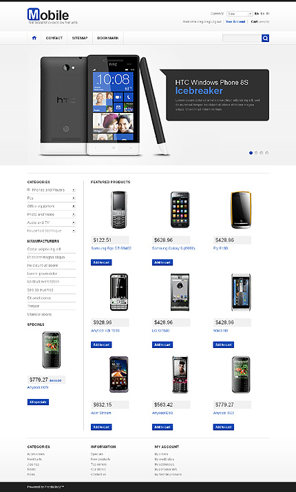 Template Name: Mobile Phones Item number: 43271 Template Type: PrestaShop Author: Hermes Downloads: 1 PrestaShop Engine: 1.5.3.1 PrestaShop Compatibility: 1.5.x The template is fully compatible with PrestaShop 1.5.x. But sample data SQL files are only compatible with the exact version of PrestaShop Engine it was developed for. Sources Av...