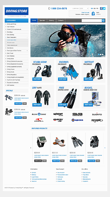 Template Name: Diving Store Item number: 42505 Template Type: PrestaShop Author: Hermes Downloads: 4 PrestaShop Engine: 1.5.2.0 PrestaShop Compatibility: 1.5.x The template is fully compatible with PrestaShop 1.5.x. But sample data SQL files are only compatible with the exact version of PrestaShop Engine it was developed for. Sources Ava...