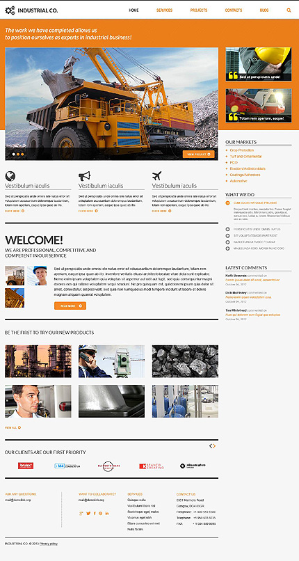 Template Name: Industrial Company Item number: 45160 Template Type: WordPress Author: Cerberus Downloads: 4 WordPress Engine: 3.5.x WordPress Compatibility: 3.2.x - 3.4.x, 3.5.x Cherry Framework Version: 1.2 Sources Available: .PSD;.PHP;This theme is widgetized Software Required: Adobe Photoshop CS+;Apache Server;For uncompressin...
