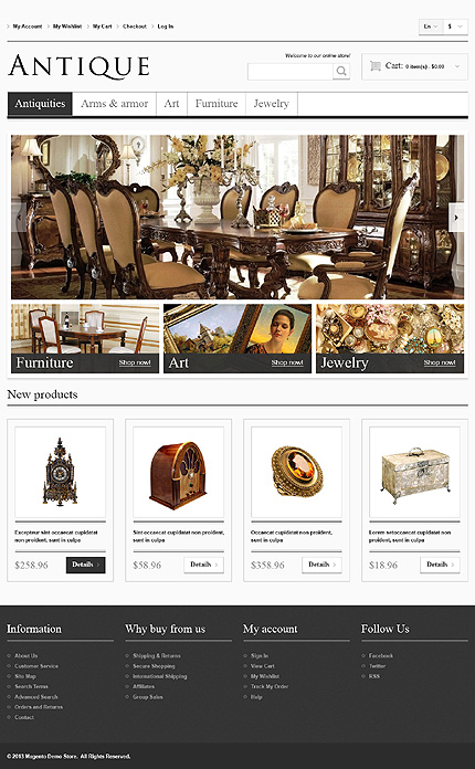 Template Name: Responsive Antiques Store Item number: 44329 Template Type: Magento Author: Hermes Downloads: 3 Magento Engine: 1.7.0.x Magento Compatibility: 1.7.x Magento Extensions: Cloud Zoom, Social Icons Sources Available: .PSD;.XML;.PHTML;.CSS Software Required: Adobe Photoshop CS+;Adobe Dreamweaver 8+ (or any php-editor);F...