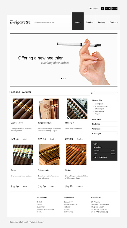 Template Name: Responsive Electronic Cigarettes Store Item number: 44438 Template Type: PrestaShop Author: Hermes Downloads: 2 PrestaShop Engine: 1.5.4.0 PrestaShop Compatibility: 1.5.x The template is fully compatible with PrestaShop 1.5.x. But sample data SQL files are only compatible with the exact version of PrestaShop Engine it was dev...