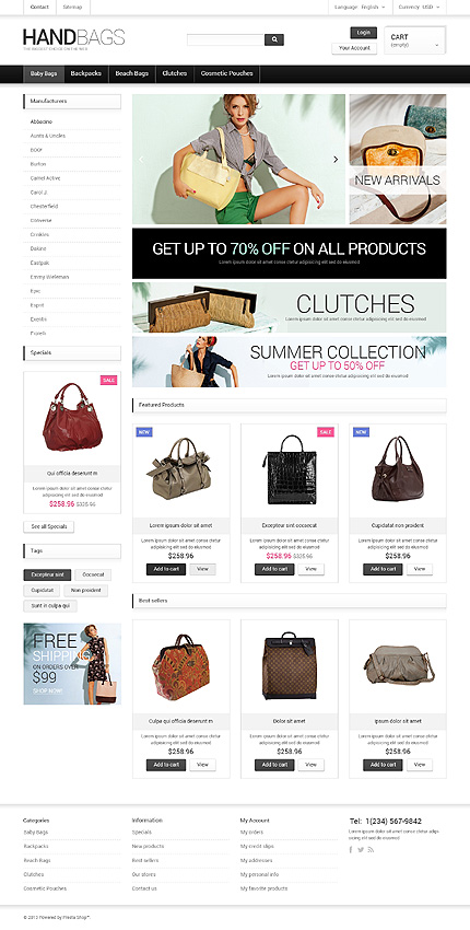 Template Name: White Handbag PrestaShop Theme by Hermes Item number: 47744 Template Type: PrestaShop Author: Hermes Downloads: 1 PrestaShop Engine: 1.5.6.1 PrestaShop Compatibility: 1.5.x The template is fully compatible with PrestaShop 1.5.x. But sample data SQL files are only compatible with the exact version of PrestaShop Engine it was developed for. Sources Available: .PSD;...