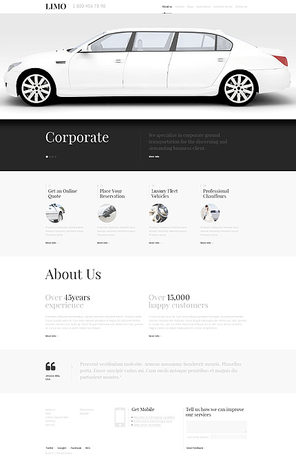 Template Name: White Limousine Services WordPress Theme by Elza Item number: 47542 Template Type: WordPress Author: Elza Downloads: 0 WordPress Engine: 3.7.x WordPress Compatibility: 3.5.x, 3.6.x, 3.7.x Cherry Framework Version: 3.0 Sources Available: .PSD;.PHP;This theme is widgetized Software Required: Adobe Photoshop CS+;Apach...