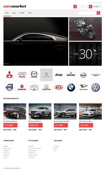 Template Name: White & Black Car Dealer PrestaShop Theme by Cowboy Item number: 47451 Template Type: PrestaShop Author: Cowboy Downloads: 0 PrestaShop Engine: 1.5.6.0 PrestaShop Compatibility: 1.5.x The template is fully compatible with PrestaShop 1.5.x. But sample data SQL files are only compatible with the exact version of PrestaShop Engine it was developed for. Sources Avail...