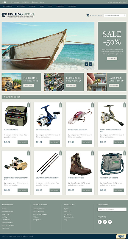 Template Name: White & Grey Fishing Magento Theme by Angela Item number: 47327 Template Type: Magento Author: Angela Downloads: 0 Magento Engine: 1.8.0.x Magento Compatibility: 1.8.0.x Magento Extensions: Cloud Zoom, Social Icons Sources Available: .PSD;.XML;.PHTML;.CSS Software Required: Adobe Photoshop CS+;Adobe Dreamweaver 8+ ...