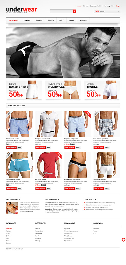 Template Name: White & Grey Men's Underwear PrestaShop Theme by Hermes Item number: 47299 Template Type: PrestaShop Author: Hermes Downloads: 0 PrestaShop Engine: 1.5.5.0 PrestaShop Compatibility: 1.5.x The template is fully compatible with PrestaShop 1.5.x. But sample data SQL files are only compatible with the exact version of PrestaShop Engine it was developed for. Sources A...