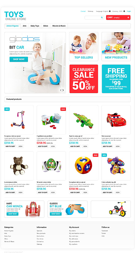Template Name: White Toy Store PrestaShop Theme by Hermes Item number: 47083 Template Type: PrestaShop Author: Hermes Downloads: 0 PrestaShop Engine: 1.5.5.0 Sources Available: .PSD;.PHP;.TPL Software Required: Adobe Photoshop CS+;Apache Server;Adobe Dreamweaver 8+ (or any php-editor);For uncompressing a template ZIP package: WinZip 9+ (Windows); Stuffit Expander 10+ (Mac);PHP...