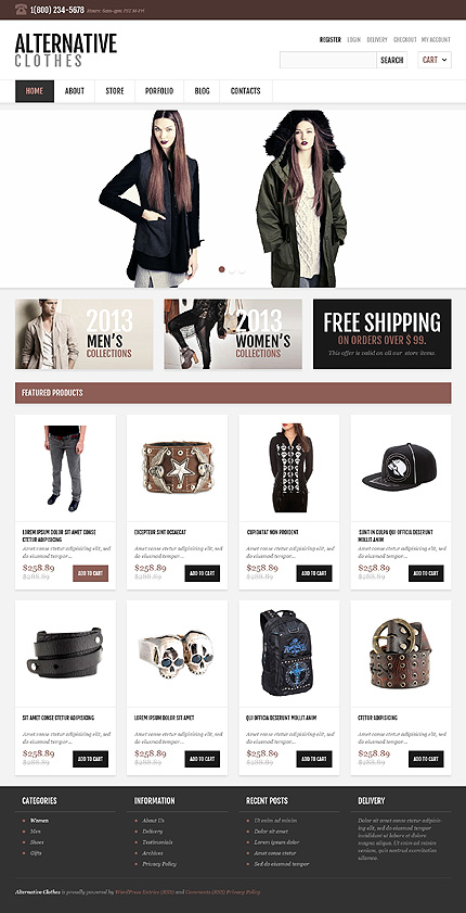 Template Name: Responsive Alternative Clothes Store Item number: 46777 Template Type: Jigoshop Author: Hermes Downloads: 0 WordPress Engine: 3.6.x Jigoshop Engine: 1.7.3 Jigoshop Compatibility: 1.7.3 Cherry Framework Version: 2.3 Sources Available: .PSD;.PHP;This theme is widgetized Software Required: Adobe Photoshop CS+;Apa...