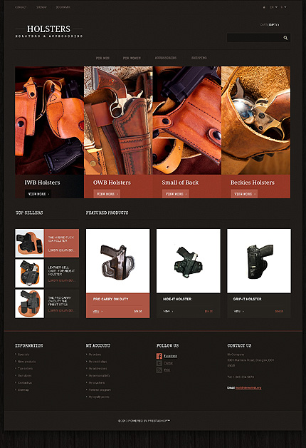 Template Name: Black & Brown Gun Shop PrestaShop Theme by Astra Item number: 46631 Template Type: PrestaShop Author: Astra Downloads: 0 PrestaShop Engine: 1.5.4.1 PrestaShop Compatibility: 1.5.x The template is fully compatible with PrestaShop 1.5.x. But sample data SQL files are only compatible with the exact version of PrestaShop Engine i...