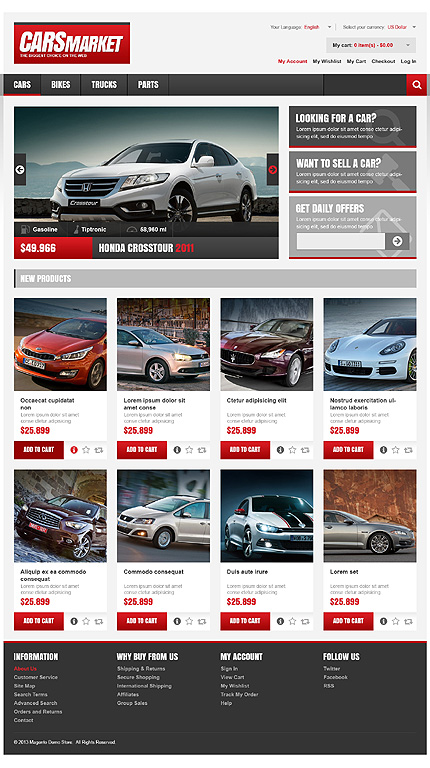 Template Name: White & Black Car Dealer Magento Theme by Hermes Item number: 46555 Template Type: Magento Author: Hermes Downloads: 0 Magento Engine: 1.7.0.x Magento Compatibility: 1.7.x Magento Extensions: Cloud Zoom, Social Icons Sources Available: .PSD;.XML;.PHTML;.CSS Software Required: Adobe Photoshop CS+;Adobe Dreamweaver 8...