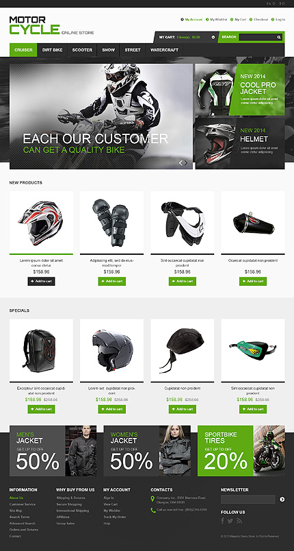 Template Name: Responsive Motorcycle Store Item number: 46436 Template Type: Magento Author: Hermes Downloads: 0 Magento Engine: 1.7.0.x Magento Compatibility: 1.7.x Magento Extensions: Cloud Zoom, Social Icons Sources Available: .PSD;.XML;.PHTML;.CSS Software Required: Adobe Photoshop CS+;Adobe Dreamweaver 8+ (or any php-editor)...