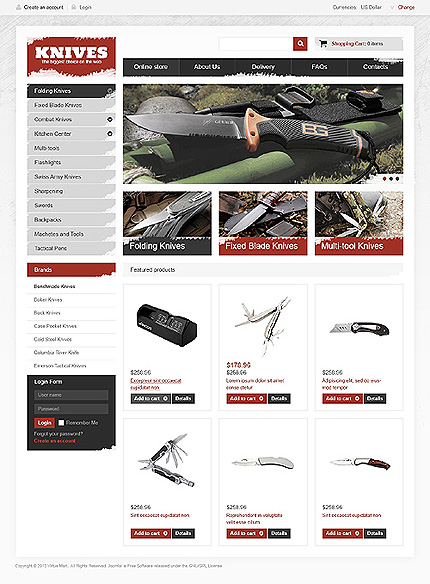 Template Name: White Gun Shop VirtueMart Template by Hermes Item number: 46282 Template Type: VirtueMart Author: Hermes Downloads: 0 VirtueMart Engine: 2.0.18 VirtueMart Compatibility: 2.0.12, 2.0.14, 2.0.16d, 2.0.18, 2.0.20b, 2.0.22a Joomla! Engine: 2.5.14 Joomla! Compatibility: 2.5.14 Sources Available: .HTML; .PSD;.PHP;.XML;.CS...