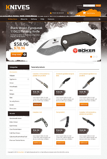 Template Name: White Gun Shop VirtueMart Template by Hermes Item number: 45721 Template Type: VirtueMart Author: Hermes Downloads: 0 VirtueMart Engine: 2.0.20b VirtueMart Compatibility: 2.0.12, 2.0.14, 2.0.16d, 2.0.18, 2.0.20b Joomla! Engine: 2.5.10 Joomla! Compatibility: 2.5.10 Sources Available: .HTML; .PSD;.PHP;.XML;.CSS;.JS ...