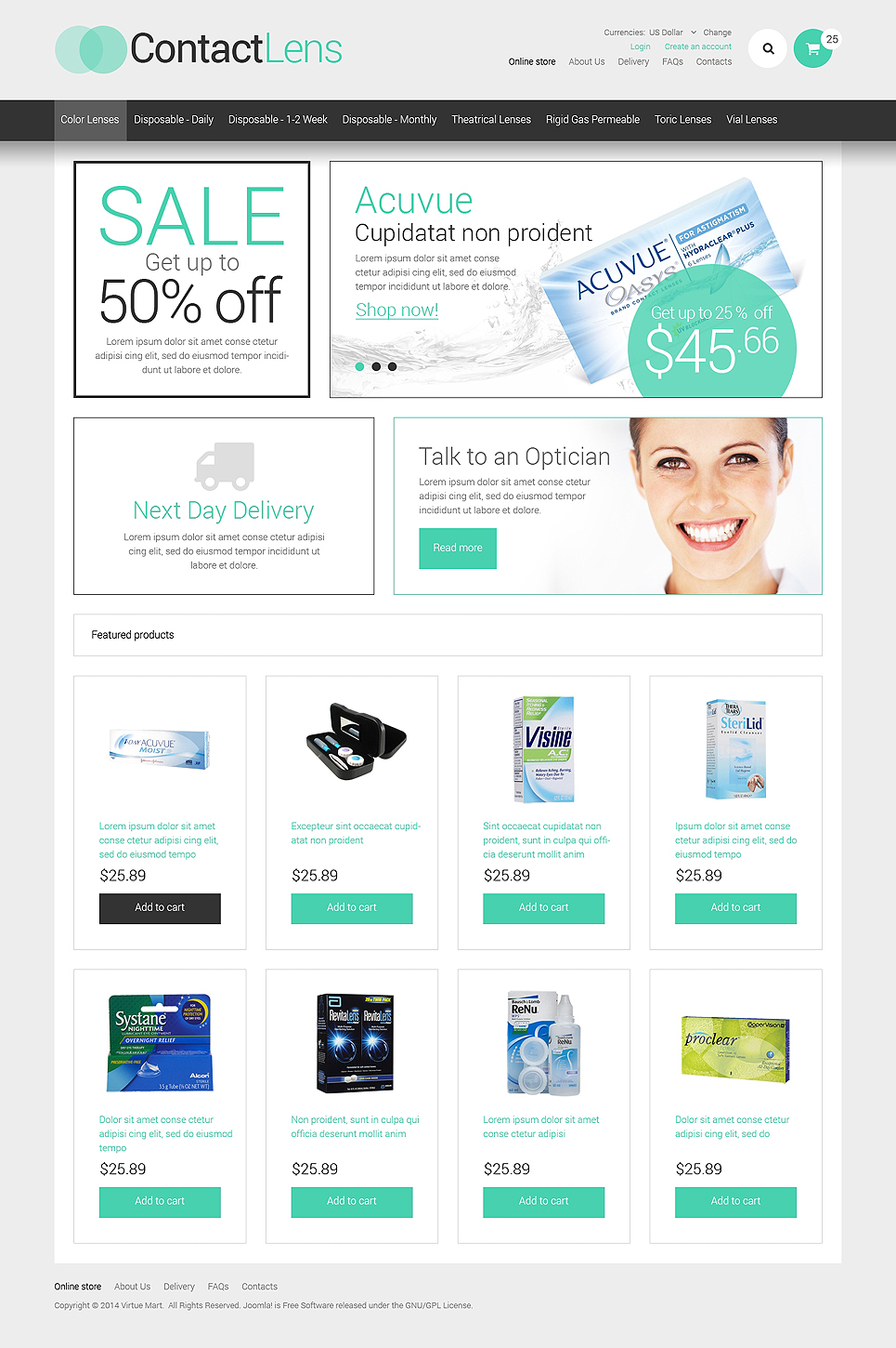 VirtueMart Engine: 2.0.26d VirtueMart Compatibility: 2.0.22a, 2.0.22d, 2.0.24, 2.0.26d Joomla! Engine: 2.5.17 Joomla! Compatibility: 2.5.9, 2.5.8, 2.5.7, 2.5.17, 2.5.16, 2.5.14, 2.5.11, 2.5.10, 2.5.0 - 2.5.x Features: Admin Panel, Ajax, Extended Package, Extra Pages Layouts Animation: HTML plus JS Functionality: Online Store/Shop Layout: 2 columns Width: 1400px Installation: Ins...